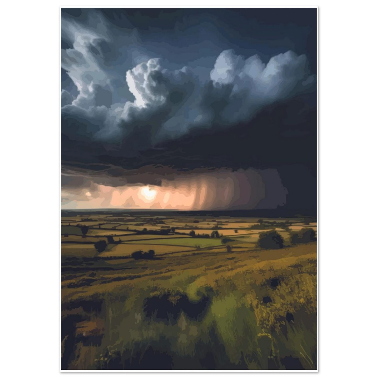 This artwork vividly portrays the dramatic interplay of nature as a summer storm sweeps across the Shropshire landscape. Lightning flickers on the horizon, while thunder reverberates through the air, creating a palpable tension. Sheets of rain cascade over the fields, and the unmistakable scent of petrichor fills the atmosphere, evoking a sense of renewal. The rich hues of the countryside contrast beautifully with the moody clouds, capturing a moment that feels both powerful and poetic.