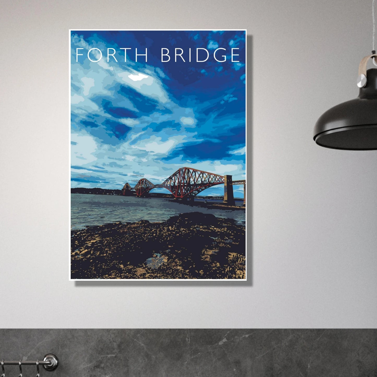 This striking artwork depicts the iconic Forth Bridge, a marvel of engineering that has stood since 1890. The piece captures the bridge's intricate design and majestic presence against a backdrop of dynamic clouds and serene waters. As a UNESCO World Heritage Site, the Forth Bridge symbolises Scotland's rich history and architectural prowess. Its bold red structure contrasts beautifully with the blue sky, inviting viewers to appreciate both its grandeur and the natural beauty surrounding it. This work honours Scotland's engineering legacy.