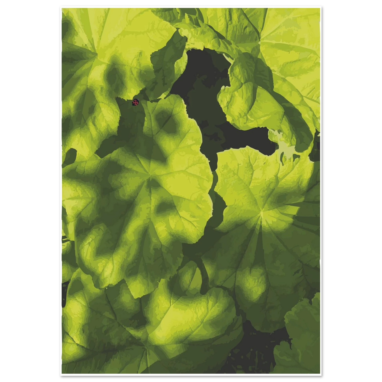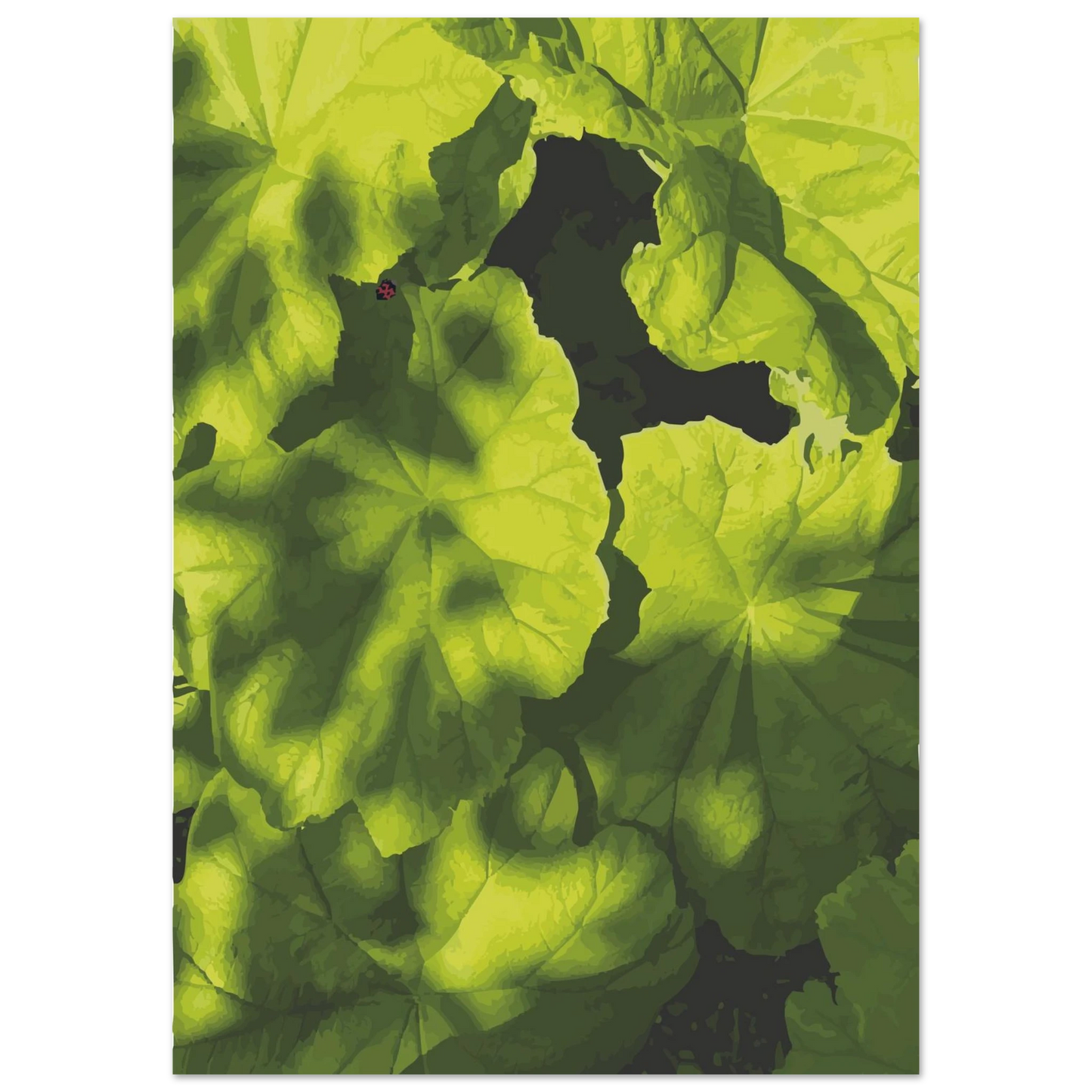 Enjoy the intricate beauty of nature with this artwork, where lush greenery unfolds in a tapestry of vibrant textures and contrasting light. The composition reveals a close-up view of leaves, each one meticulously detailed, showcasing the interplay of shadows and highlights. A subtle hint of a ladybird adds a touch of whimsy, inviting the viewer to explore the hidden wonders of the natural world.